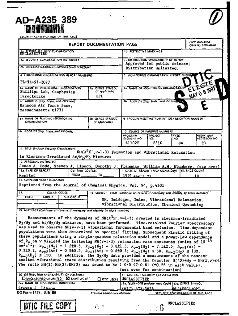 ADA235 389)c×. Uhl\”FI I SLAM.ILAIIlUN WII I HIS PAGE OM AoOO4.8REPORT DOCUMENTATION PAGE IB RESTRICTIVE MARKINGS TY CLASSIFICATION%MISffTL2a. SECURITY CLASSIFICATION AUTHORITY3. DISTRIBUTION/