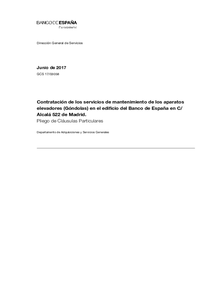 Direccin General de ServiciosJunio de 2017 GCS 17/03058Contratacin de los servicios de mantenimiento de los aparatos elevadores (Gndolas) en el edificio del Banco de Espaa en C/ Alcal 522 de Madrid.