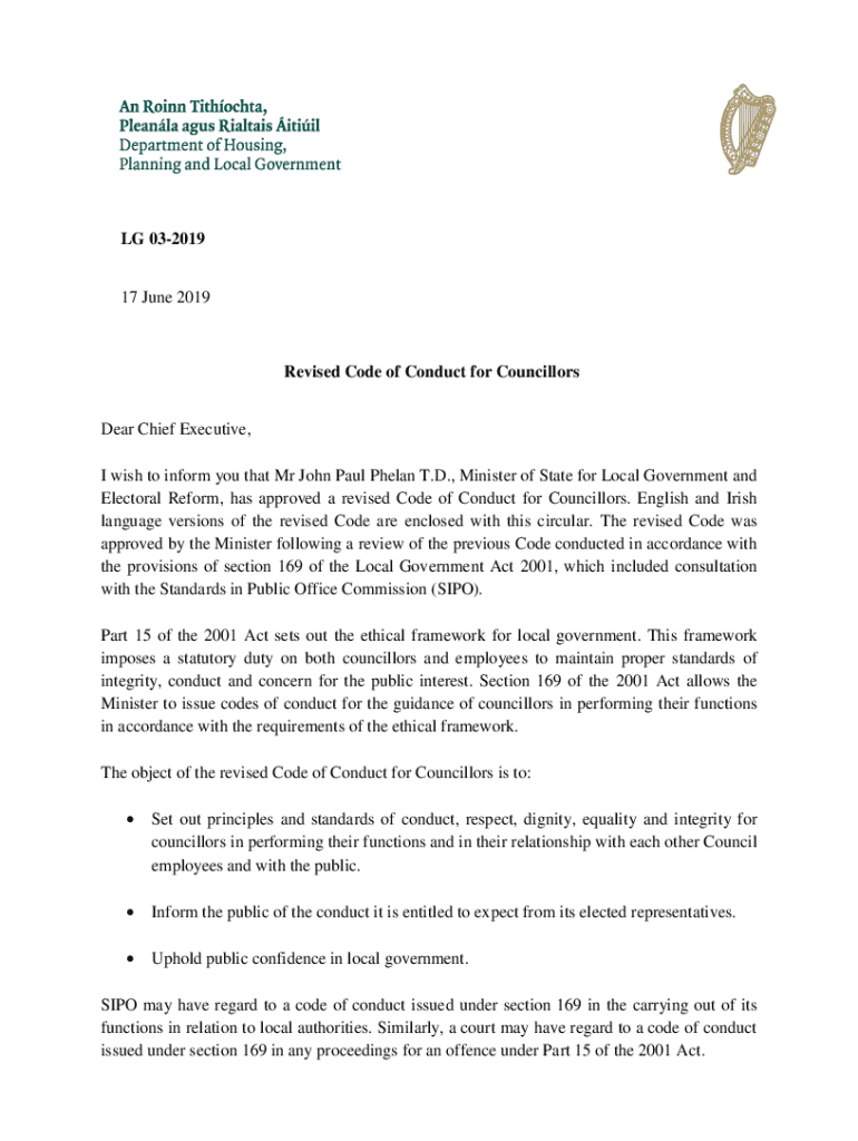 LG 032019 17 June 2019Revised Code of Conduct for Councillors Dear Chief Executive, I wish to inform you that Mr John Paul Plan T.D., Minister of State for Local Government and Electoral Reform, has