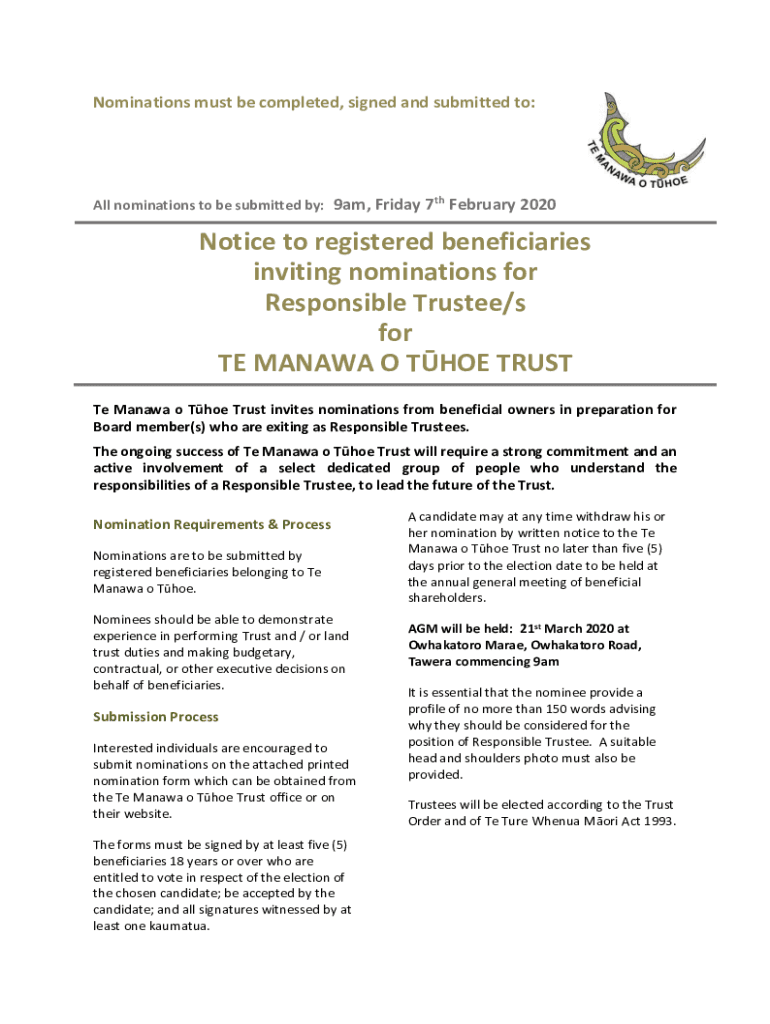 Nominations must be completed, signed and submitted to:All nominations to be submitted by: 9am, Friday 7th February 2020Notice to registered beneficiaries inviting nominations for Responsible Trustee/s