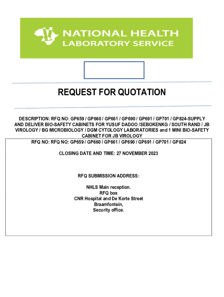REQUEST FOR QUOTATION DESCRIPTION: RFQ NO: GP659 / GP660 / GP661 / GP690 / GP691 / GP701 / GP824SUPPLY AND DELIVER BIOSAFETY CABINETS FOR YUSUF DADO /SEBOKENKG / SOUTH RAND / JB VIROLOGY / BG MICROBIOLOGY