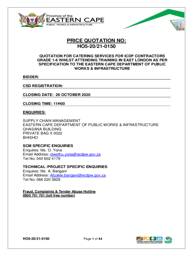PRICE QUOTATION NO: HO520/210150 QUOTATION FOR CATERING SERVICES FOR ICP CONTRACTORS GRADE 16 WHILST ATTENDING TRAINING IN EAST LONDON AS PER SPECIFICATION TO THE EASTERN CAPE DEPARTMENT OF PUBLIC