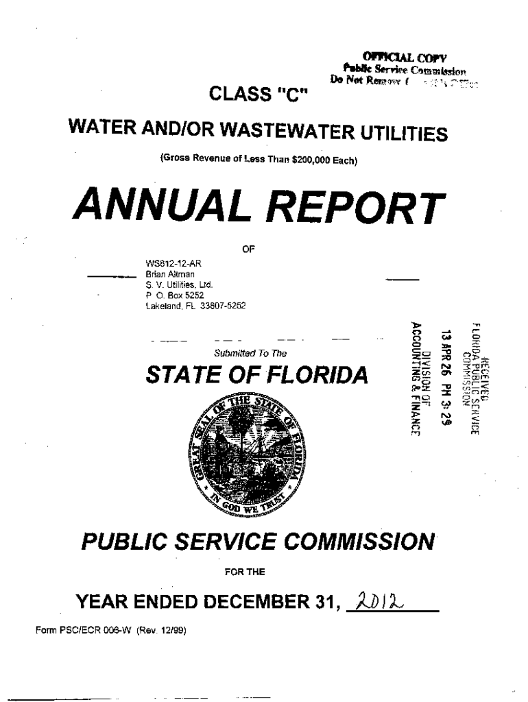 CLASS \”C\” WATER AND/OR WASTEWATER UTILITIES (Gross Revenue of Less Than $200,000 Each)ANNUAL REPORT OF WS81212AR Brian Altman S. V. Utilities, Ltd. P. 0. Box 5252 Lakeland, FL 338075252(\')n0C::o