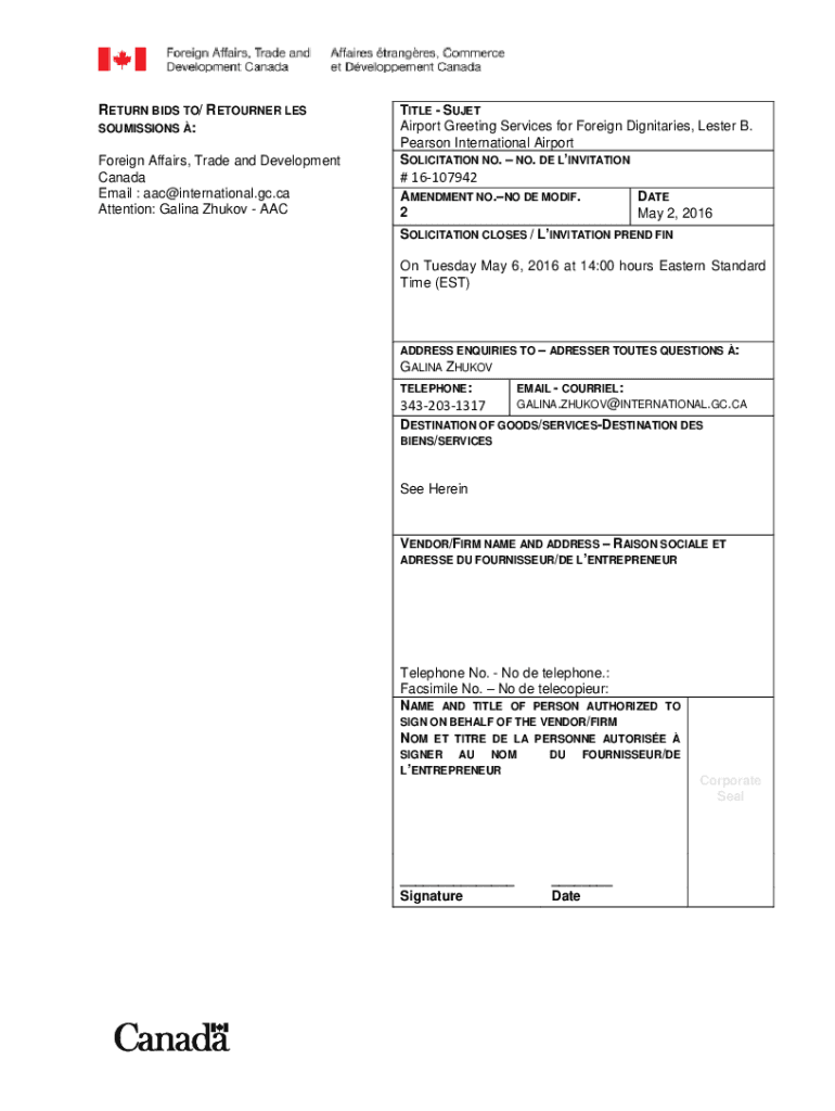 RETURN BIDS TO/ RETURNER LES COMMISSIONS : Foreign Affairs, Trade and Development Canada Email : aac@international.gc.ca Attention: Galena Zhukov TACTILE SUET Airport Greeting Services for Foreign
