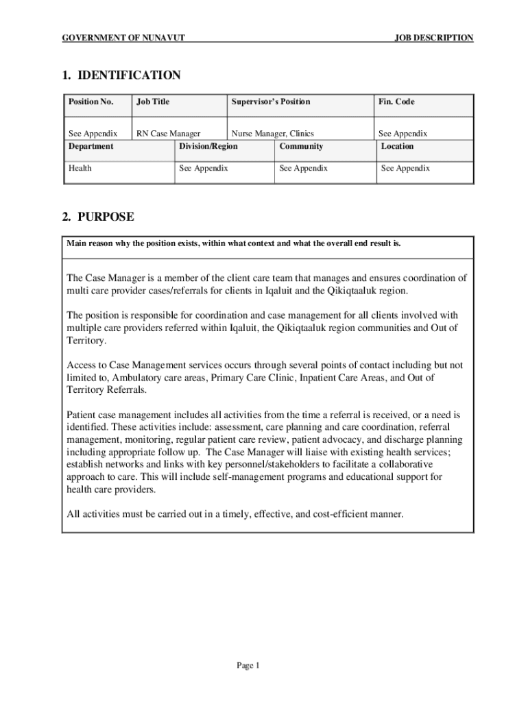 GOVERNMENT OF NUNAVUTJOB DESCRIPTION1. IDENTIFICATION Supervisors PositionPosition No.Job TitleSee Appendix DepartmentRN Case Manager Nurse Manager, Clinics Division/Region CommunityHealthSee AppendixSee