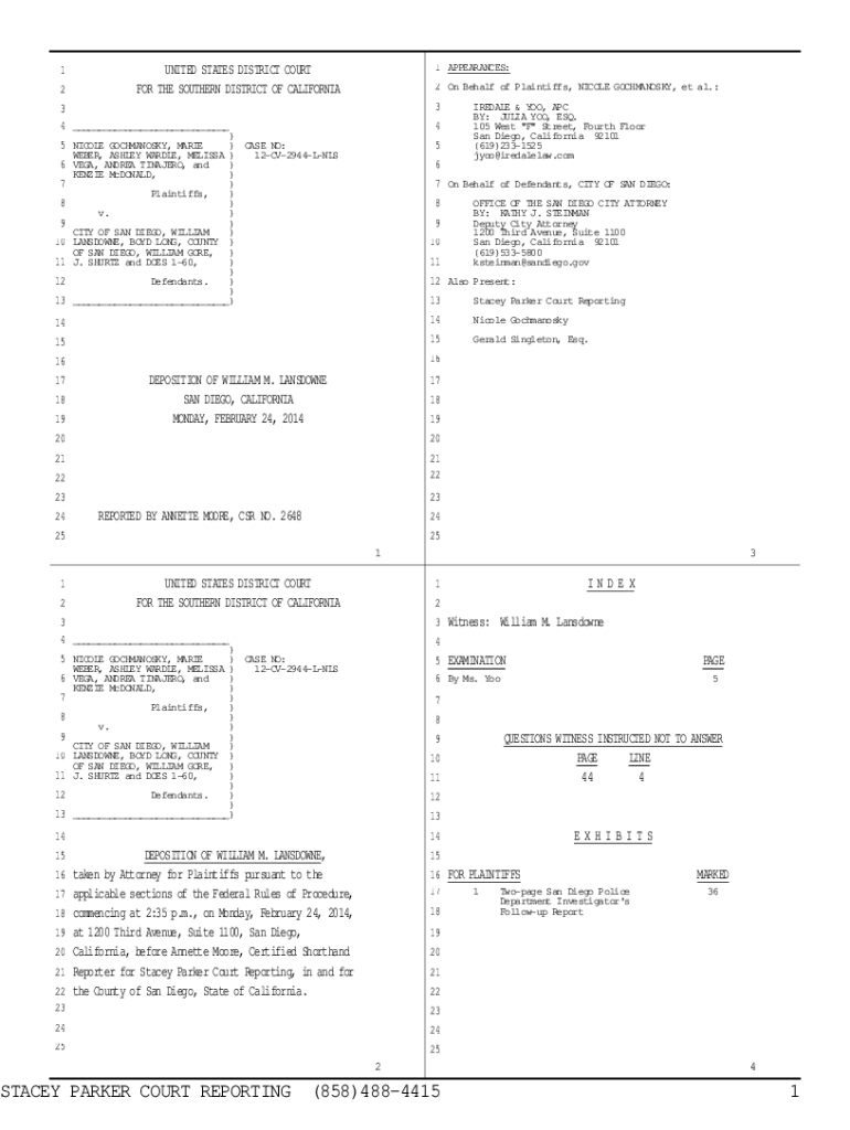 1 21 APPEARANCES:UNITED STATES DISTRICT COURT FOR THE SOUTHERN DISTRICT OF CALIFORNIA2 On Behalf of Plaintiffs, NICOLE GOCHMANOSKY, et al.: 33 4 ___4)) CASE NO: WEBER, ASHLEY WARBLE, MELISSA) 12CV2944LNLS