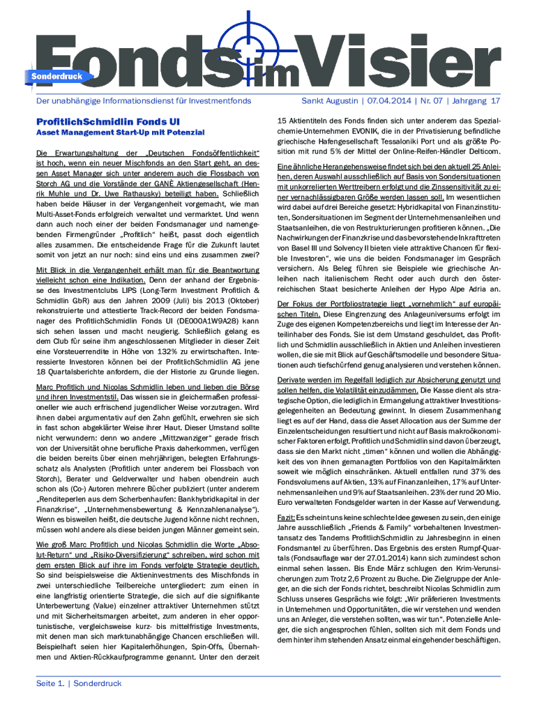 Der unabhngige Informationsdienst fr InvestmentfondsProfitlichSchmidlin Fonds UIAsset Management StartUp mit Potenzial