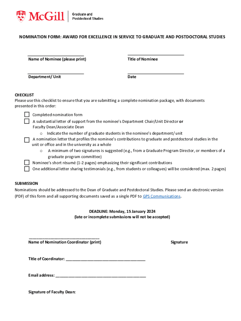 NOMINATION FORM: AWARD FOR EXCELLENCE IN SERVICE TO GRADUATE AND POSTDOCTORAL STUDIESName of Nominee (please print)Title of NomineeDepartment/ UnitDateCHECKLIST Please use this checklist to ensure