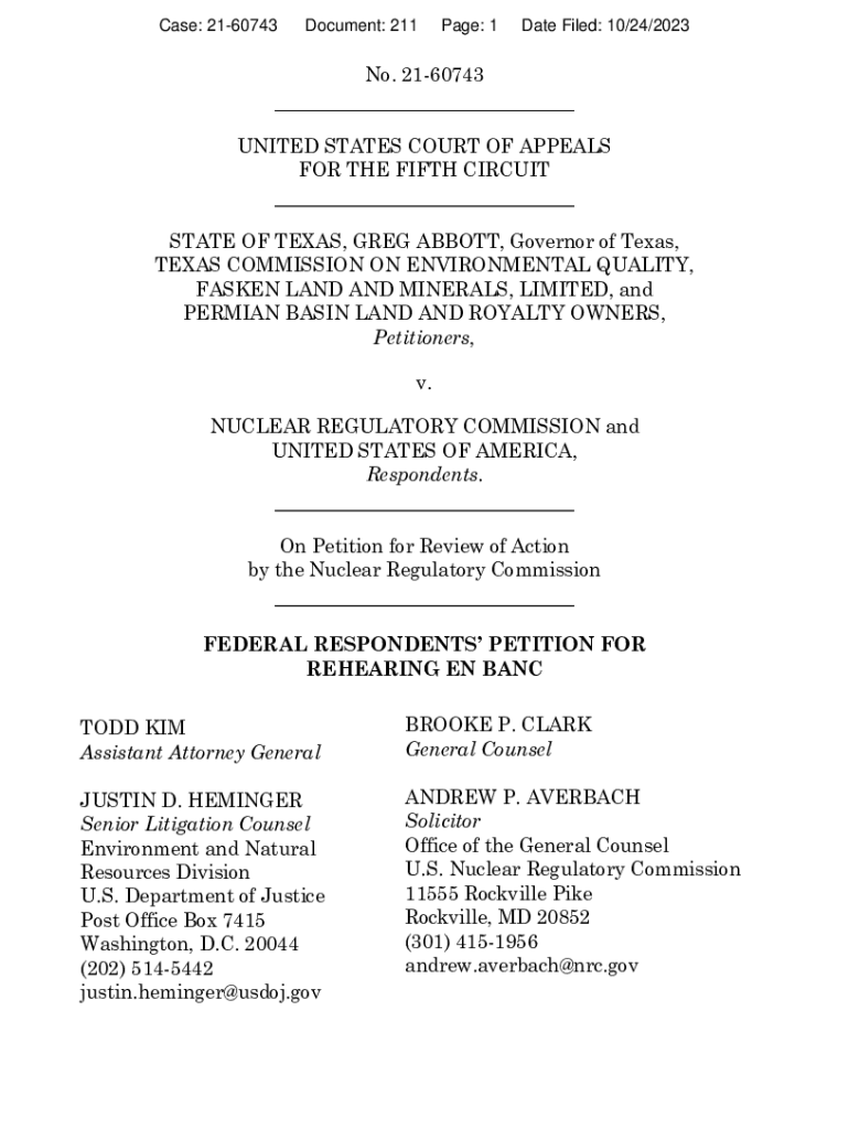 Case: 2160743Document: 211Page: 1Date Filed: 10/24/2023No. 2160743 UNITED STATES COURT OF APPEALS FOR THE FIFTH CIRCUIT STATE OF TEXAS, GREG ABBOTT, Governor of Texas, TEXAS COMMISSION ON ENVIRONMENTAL