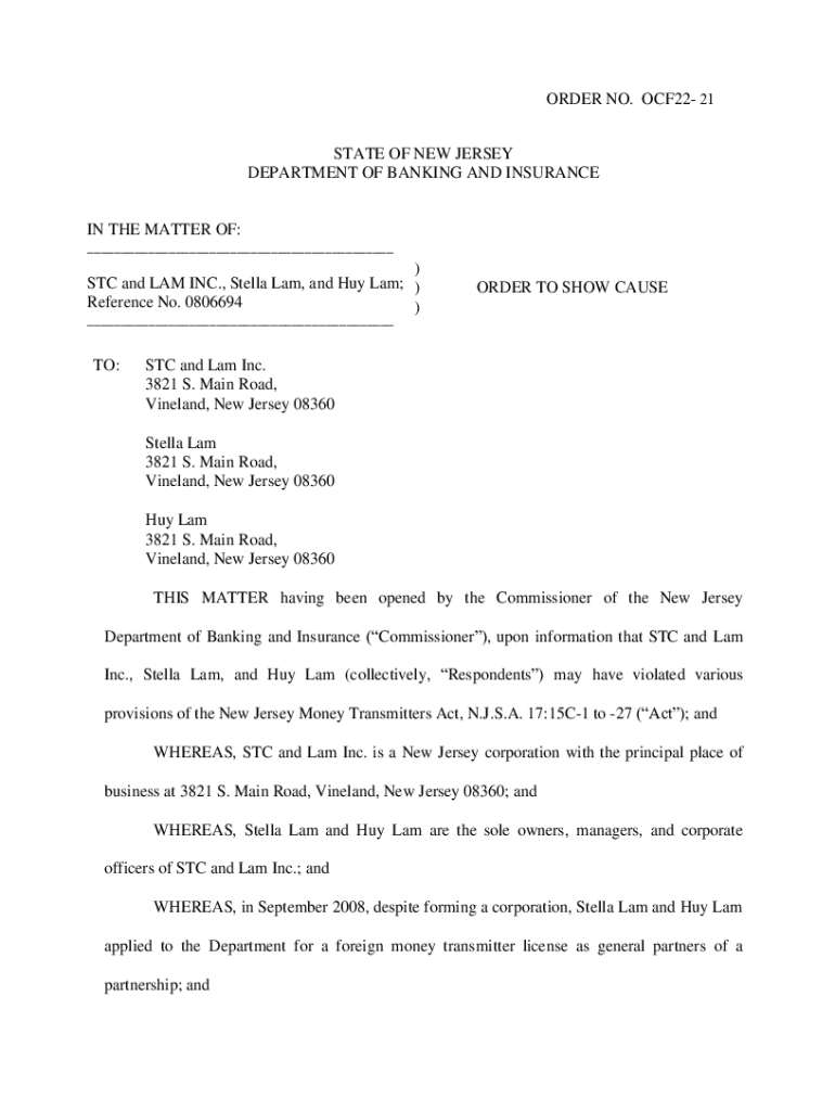 ORDER NO. OCF22 21 STATE OF NEW JERSEY DEPARTMENT OF BANKING AND INSURANCE IN THE MATTER OF: ___) STC and LAM INC., Stella Lam, and Hey Lam;) Reference No. 0806694)ORDER Showing CAUSE___TO:STC and