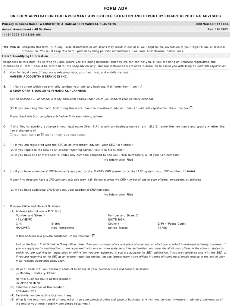 FORM ADV UNIFORM APPLICATION FOR INVESTMENT ADVISER REGISTRATION AND REPORT BY EXEMPT REPORTING ADVISERS Primary Business Name: WADSWORTH & DAULAIRE FINANCIAL PLANNERSCRD Number: 116464Annual Amendment