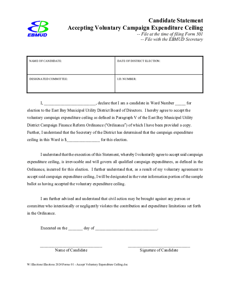 Candidate Statement Accepting Voluntary Campaign Expenditure Ceiling File at the time of filing Form 501 File with the MUD SecretaryNAME OF CANDIDATE:DATE OF DISTRICT ELECTION:DESIGNATED COMMITTEE:I.D.