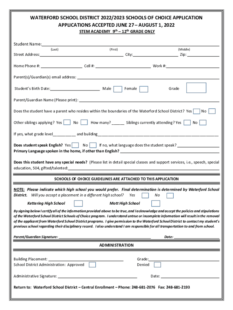 WATERFORD SCHOOL DISTRICT 2022/2023 SCHOOLS OF CHOICE APPLICATION APPLICATIONS ACCEPTED JUNE 27 AUGUST 1, 2022, STEM ACADEMY 9th 12th GRADE ONLY Student Name: (Last)(First)Street Address:(Middle)City:Home