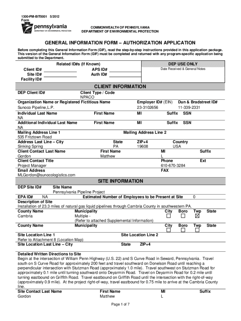 DEPARTMENT OF ENVIRONMENTAL PROTECTIONGENERAL INFORMATION FORM AUTHORIZATION APPLICATION