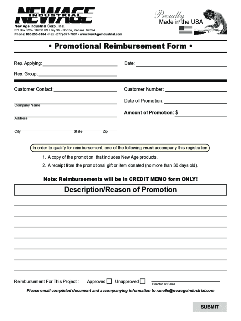New Age Industrial Corp., Inc. PO Box 520 16788 US Hwy 36 Norton, Kansas 67654 Phone: 8002550104 Fax: (877)8777687 www.NewAgeIndustrial.com Promotional Reimbursement Form Rep. Applying:Date:Rep. Group:Customer