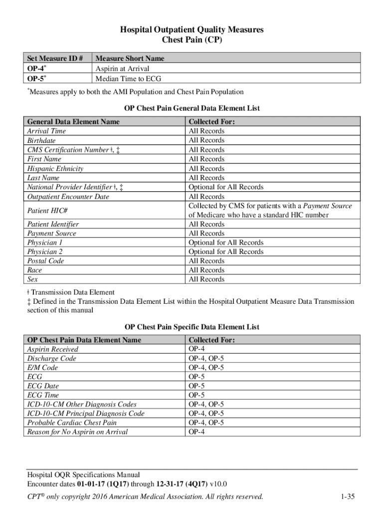 Material inside brackets ([and]) is new to these Specifications Manual version. Hospital Outpatient Quality Measures Chest Pain (CP) Set Measure ID # OP4* OP5* *Measure Short Name Aspirin at Arrival