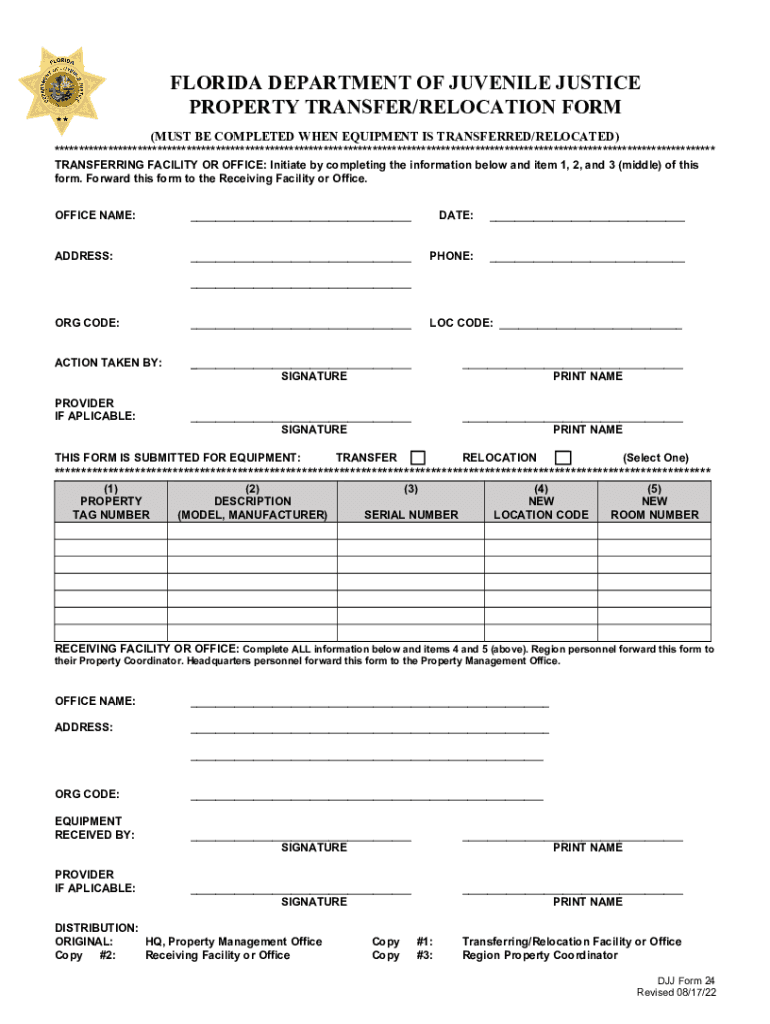 FLORIDA DEPARTMENT OF JUVENILE JUSTICE PROPERTY TRANSFER/RELOCATION FORM (MUST BE COMPLETED WHEN EQUIPMENT IS TRANSFERRED/RELOCATED) ***************************************************************************************************************************************TRANSFERRING