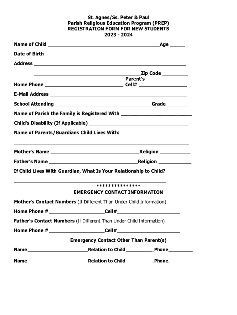 St. Agnes/SS. Peter & Paul Parish Religious Education Program (PREP) REGISTRATION FORM FOR NEW STUDENTS 2023 2024 Name of Child ___Age ___ Date of Birth ___ Address ___ ___Zip Code ___ Parents Home
