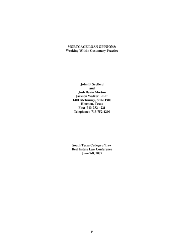 MORTGAGE LOAN OPINIONS: Working Within Customary Practice John B. Schofield and Josh Davis Morton Jackson Walker L.L.P. 1401 McKinney, Suite 1900 Houston, Texas Fax: 7137524221 Telephone: 7137524200South