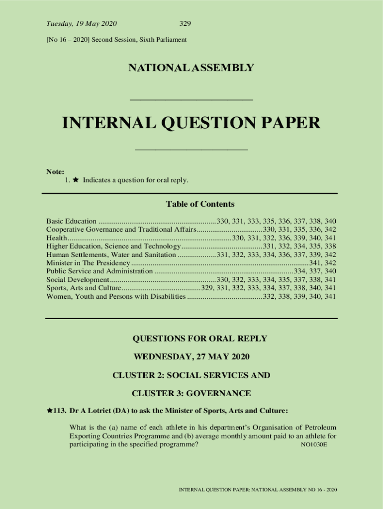 Tuesday, 19 May 2020329[No 16 2020] Second Session, Sixth ParliamentNATIONAL ASSEMBLY ___INTERNAL QUESTION PAPER ___ Note: 1. Indicates a question for oral reply. Table of Contents Basic Education