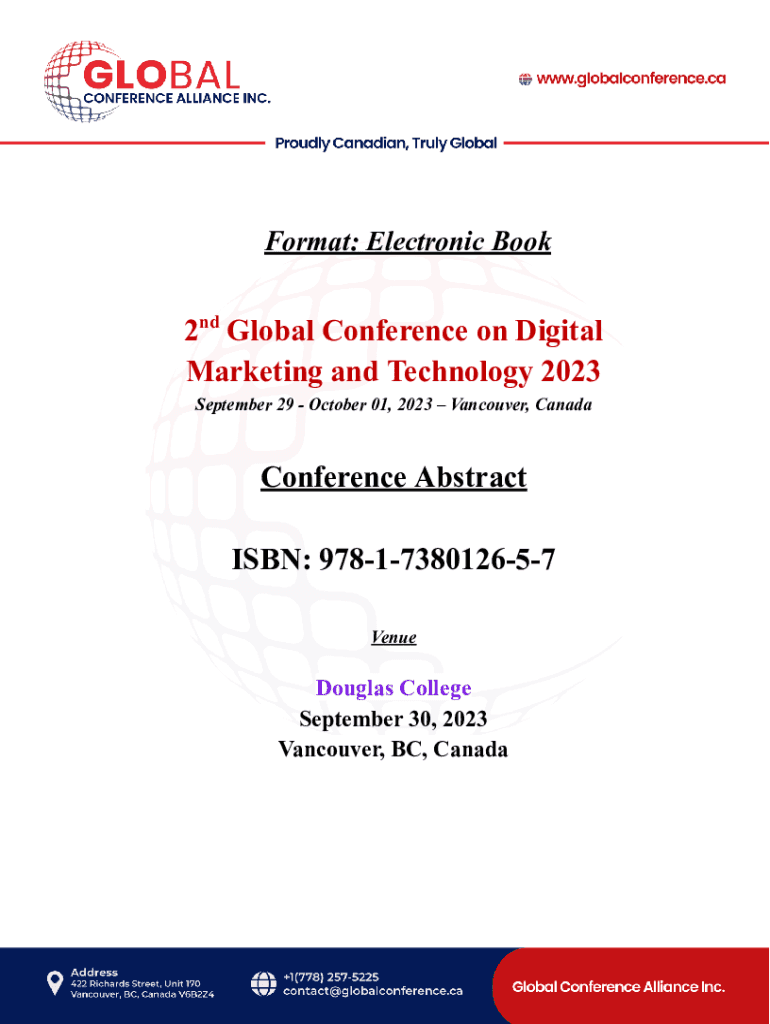Format: Electronic Book2nd Global Conference on Digital Marketing and Technology 2023 September 29 October 01, 2023, Vancouver, CanadaConference Abstract ISBN: 9781738012657 Venue Douglas College