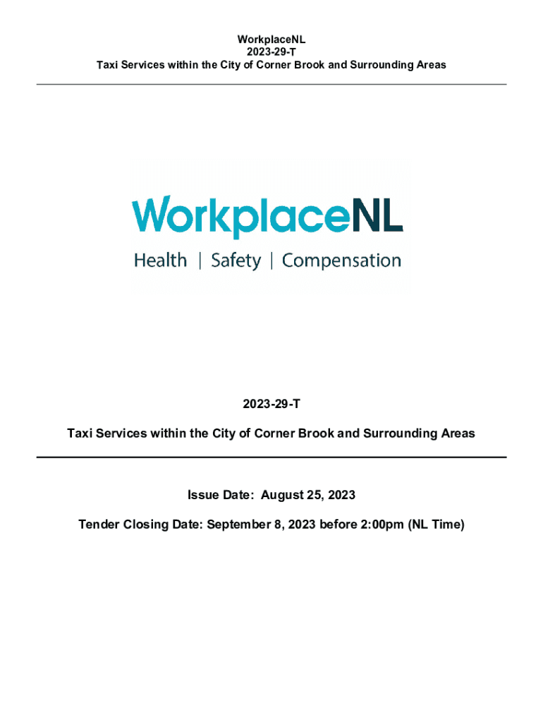 Workplace NL 202329T Taxi Services within the City of Corner Brook and Surrounding Areas202329T Taxi Services within the City of Corner Brook and Surrounding Reissue Date: August 25, 2023, Tender