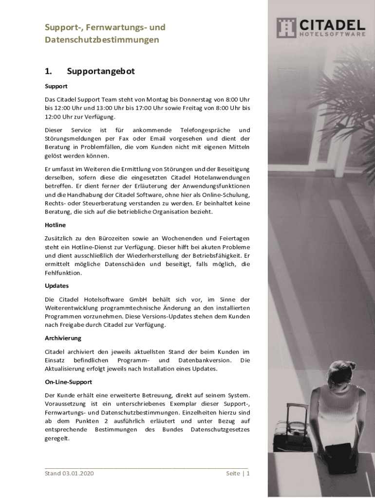 Support, Fernwartungs und Datenschutzbestimmungen 1.SupportangebotSupport Das Citadel Support Team steht von Montag bis Donnerstag von 8:00 Uhr bis 12:00 Uhr und 13:00 Uhr bis 17:00 Uhr sowie Freitag