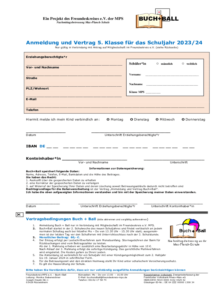 BUCH+BALLEin Projekt des Freundeskreises e.V. der MPS Nachmittagsbetreuung MaxPlanckSchule:Anmeldung und Vertrag 5. Klasse fr das Schuljahr 2023/24 Nur gltig in Verbindung mit Antrag auf Mitgliedschaft