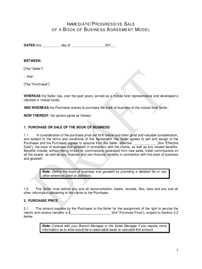 OF AI MMEDIATE /P ROGRESSIVE S ALE B OOK OF B USINESS A GREEME NT M ODELDATED this ___ day of ___201__.BETWEEN: [The Seller] And [The Purchaser]WHEREAS the Seller has, over the past years, served