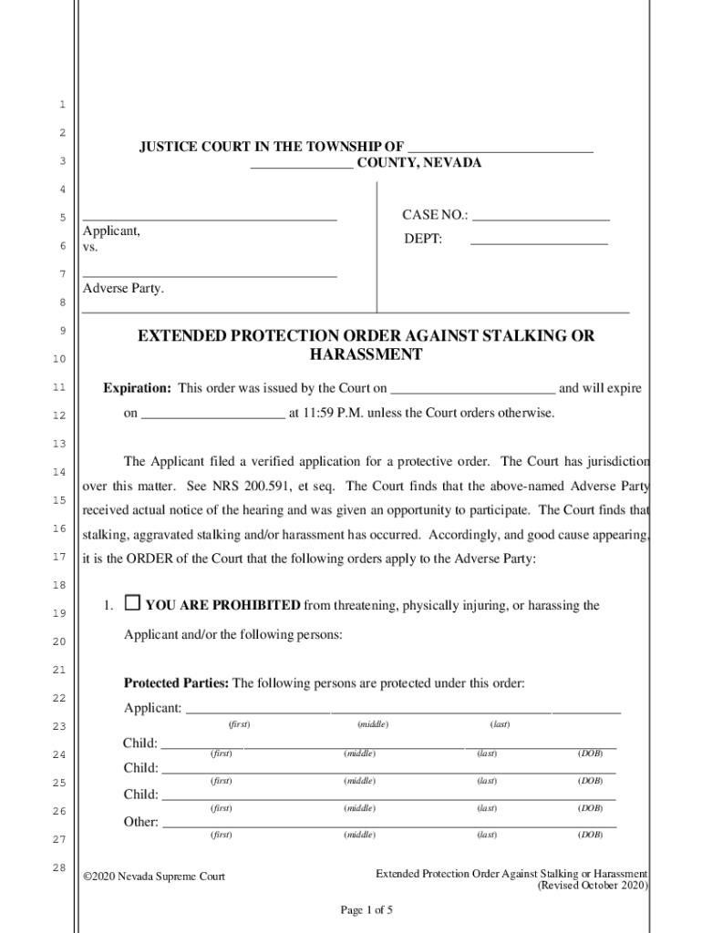 1 2JUSTICE COURT IN THE TOWNSHIP OF ___ ___ COUNTY, NEVADA3 4 5 6 7___ Applicant, vs. CASE NO.: ___ DEPT:______ Adverse Party.8 9EXTENDED PROTECTION ORDER AGAINST STALKING OR HARASSMENT10 11Expiration: