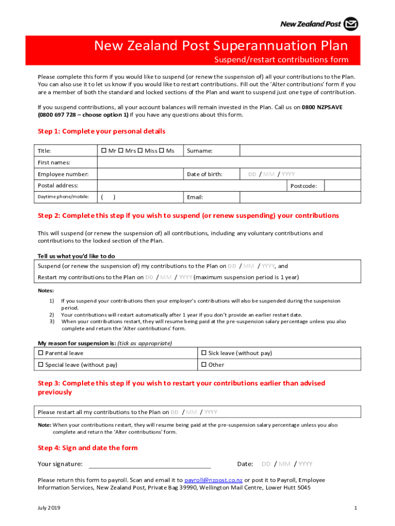 New Zealand Post Superannuation Plan Suspend/restart contributions form Please complete this form if you would like to suspend (or renew the suspension of) all your contributions to the Plan. You