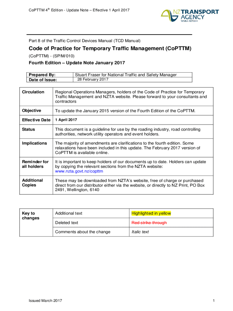 ThCoPTTM 4 Edition Update Note Effective 1 April 2017Part 8 of the Traffic Control Devices Manual (TCD Manual)Code of Practice for Temporary Traffic Management (Coptic) (Coptic) (SP/M/010)Fourth Edition