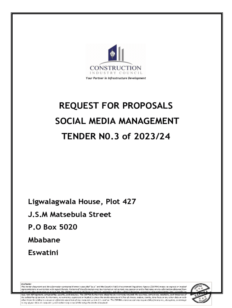REQUEST FOR PROPOSALS SOCIAL MEDIA MANAGEMENT TENDER N0.3 of 2023/24Ligwalagwala House, Plot 427 J.S.M Matsebula Street P.O Box 5020 Mbabane EswatiniTABLE OF CONTENTS1.PREAMBLE ......................................................................................................................