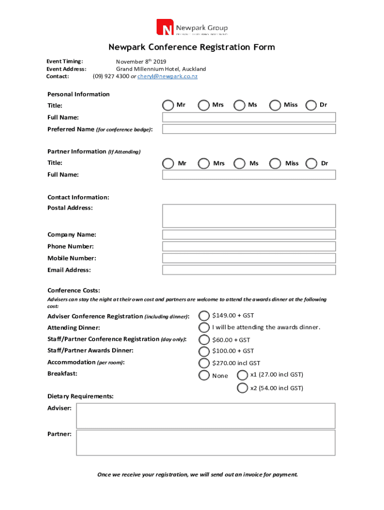 Newpark Conference Registration Form Event Timing: Event Address: Contact:November 8th 2019 Grand Millennium Hotel, Auckland (09) 927 4300 or cheryl@newpark.co.nzPersonal Information Title:MrMrsMsMissDrMrMrsMsMissDrFull