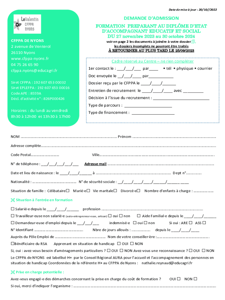 Date demise four : 20/10//2022DEMANDE DADMISSIONCFPPA DE LYONS 2 avenue de Ventral 26110 Lyons www.cfppanyons.fr 04 75 26 65 90 cfppa.nyons@educagri.frFORMATION PREPARING AU DIP LME DET AT DACCOMPAGNANT