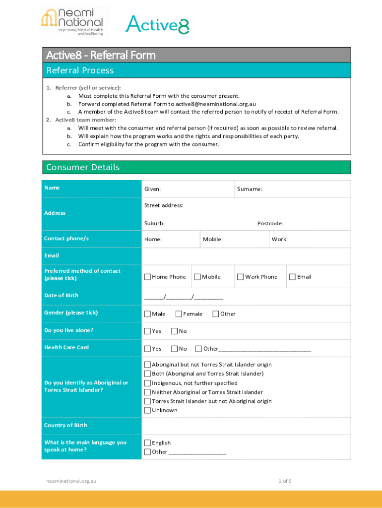 Active8 Referral Form Referral Process 1. Referrer (self or service): a. Must complete this Referral Form with the consumer present. b. Forward completed Referral Form to active8@neaminational.org.au