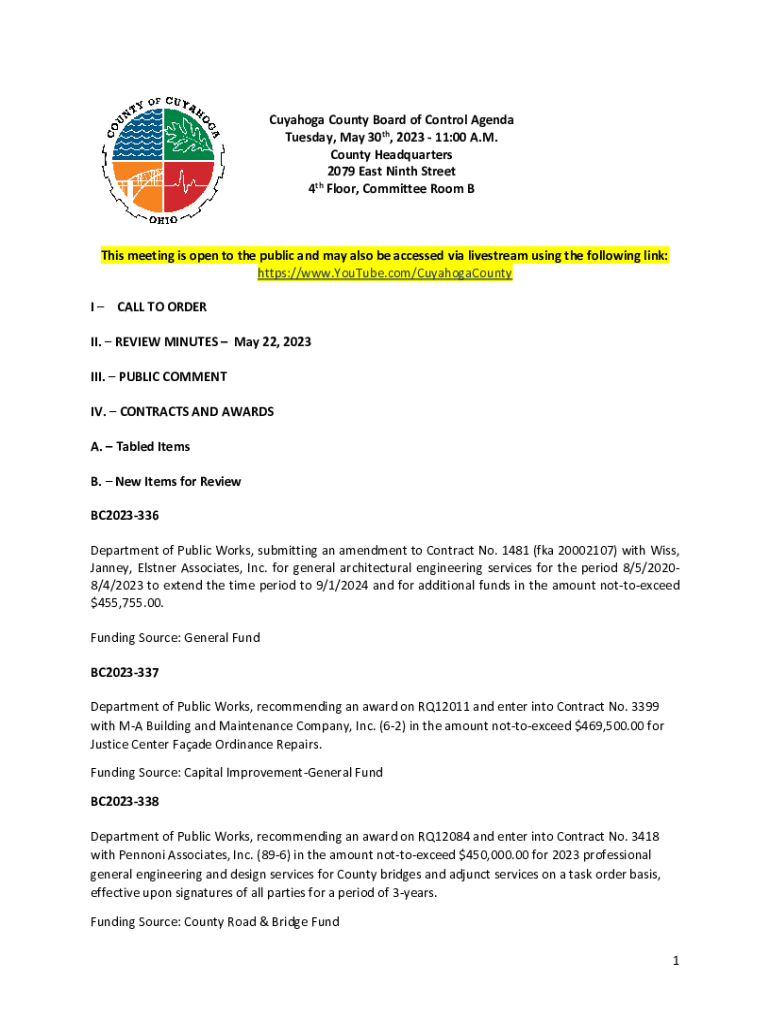 DR Cuyahoga County Board of Control Agenda Tuesday, May 30th, 2023 11:00 A.M. County Headquarters 2079 East Ninth Street 4th Floor, Committee Room This meeting is open to the public and may also be
