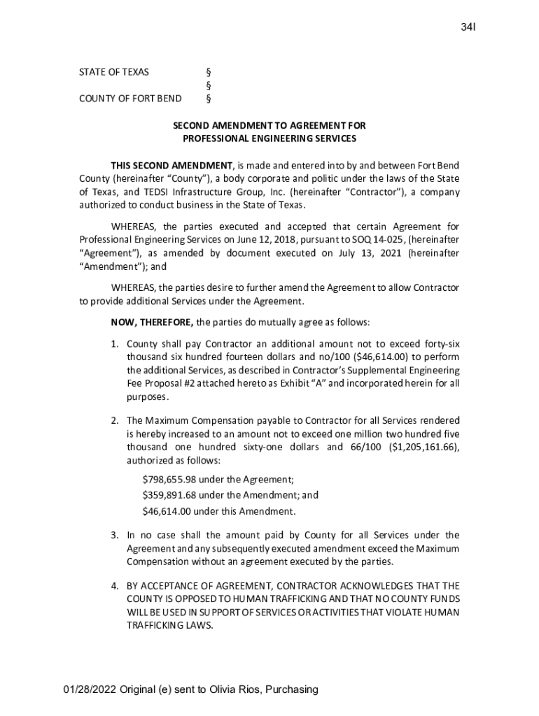 34ISTATE OF TEXAS COUNTY OF FORT BEND SECOND AMENDMENT TO AGREEMENT FOR PROFESSIONAL ENGINEERING SERVICES THIS SECOND AMENDMENT, is made and entered into by and between Fort Bend County (hereinafter