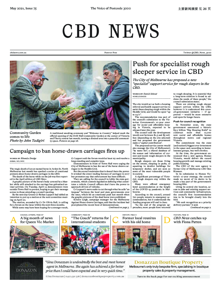 May 2021, Issue 75The Voice of Postcode 3000cbdnews.com.AU 26 Forever Free Twitter CBD_News_3000Push for specialist rough sleeper service in CBD The City of Melbourne has proposed a new specialist