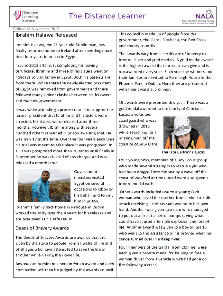 The Distance Learner Edition 41 November, 2017Ibrahim Halfway Released Ibrahim Halfway, the 21yearold Dublin man, has finally returned home to Ireland after spending more than four years in prison