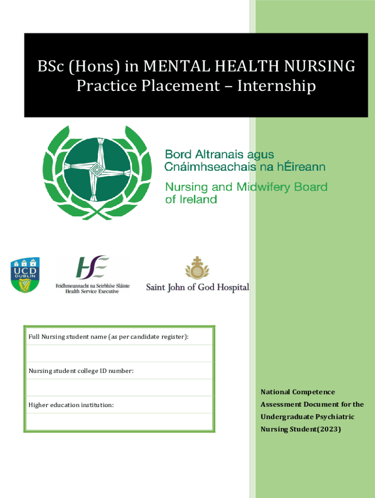 B.Sc. (Hons) in MENTAL HEALTH NURSING Practice Placement InternshipFull Nursing student name (as per candidate register):Nursing student college ID number:National Competence Higher education institution:Assessment