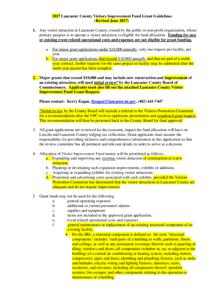 2017 Lancaster County Visitors Improvement Fund Grant Guidelines (Revised June 2017) 1. Any visitor attraction in Lancaster County, owned by the public or nonprofit organization, whose primary purpose