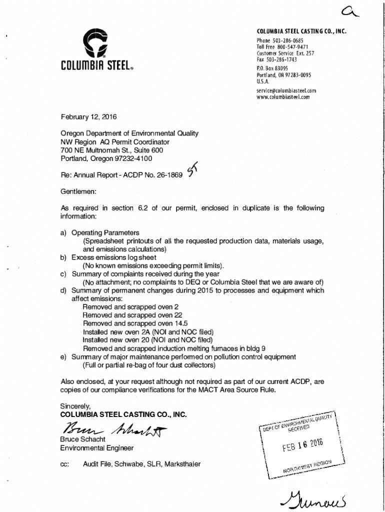(;. Columbia STEELCOLUMBIA STEEL CASTING CO., INC. Phone 5032860685 Toll Free 8005479471 Customer Service Ext. 257 Fax 5032861743 P.O. Box 83095 Portland, OR 972830095 U.S.A. serve Cecil u master