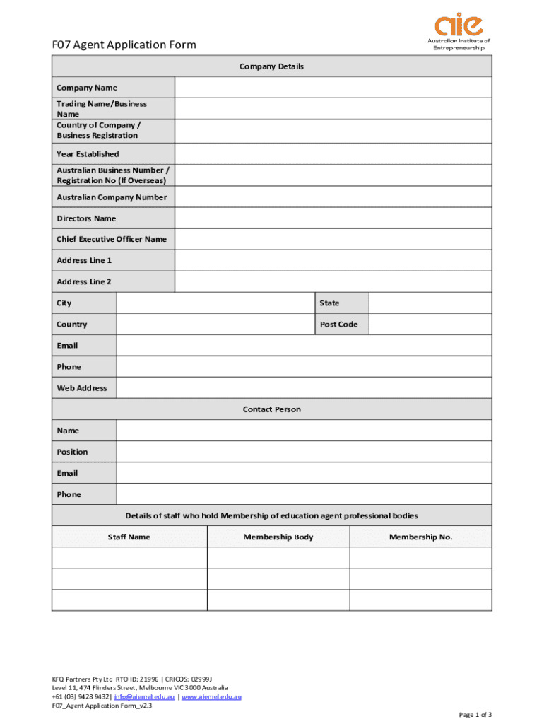 F07 Agent Application Form Company Details Company Name Trading Name/Business Name Country of Company / Business Registration Year Established Australian Business Number / Registration No (If Overseas)