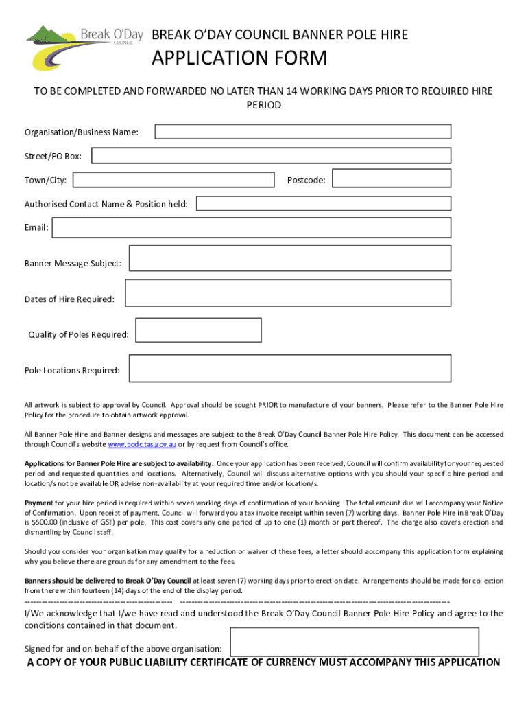Get the free break o'day council banner pole hire - application form