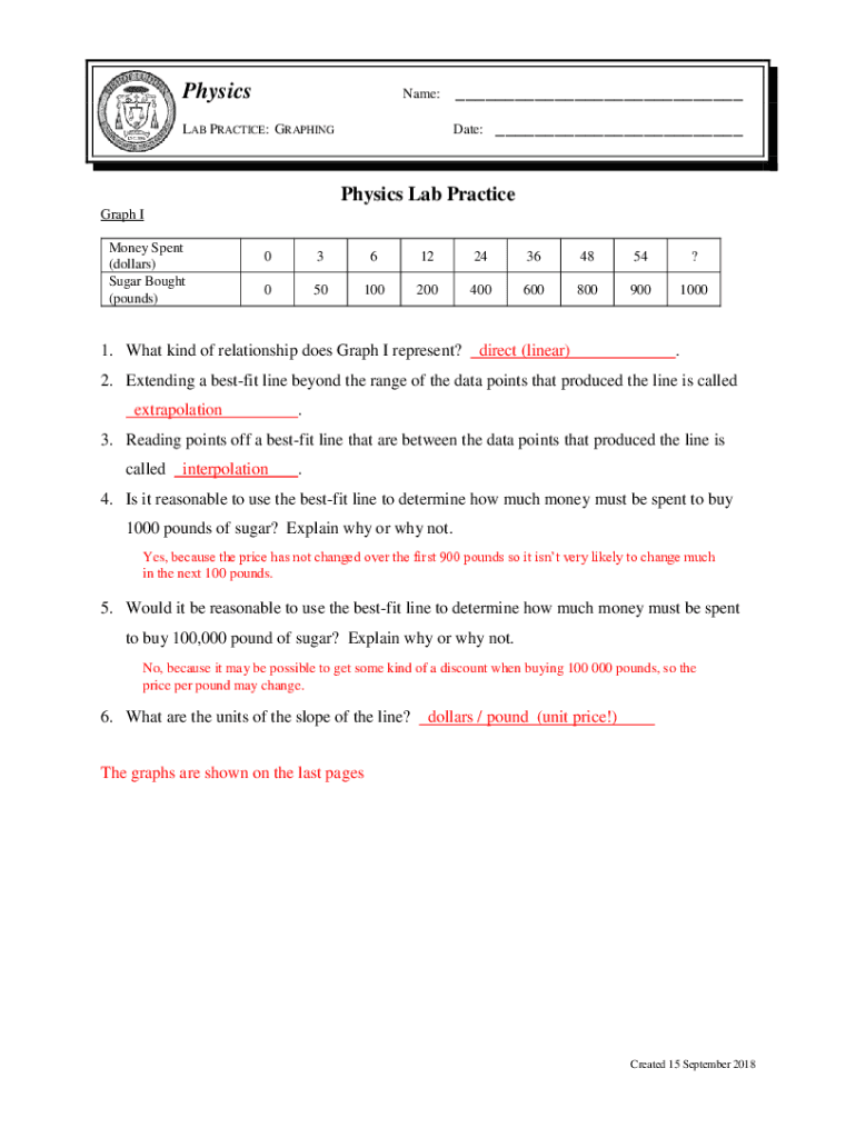 PhysicsName:LAB PRACTICE: GRAPHING___ Date:___Physics Lab Practice Graph I Money Spent (dollars) Sugar Bought (pounds)0361224364854?05010020040060080090010001. What kind of relationship does Graph