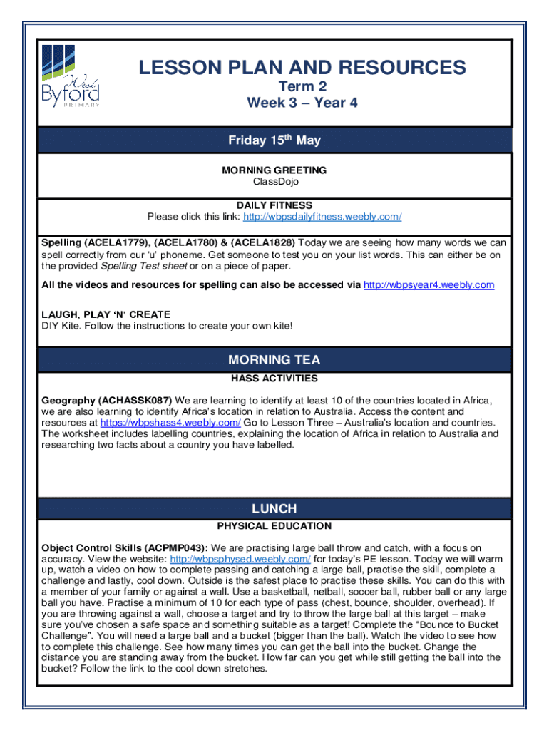 LESSON PLAN AND RESOURCES Term 2 Week 3 Year 4 Friday 15th May MORNING GREETING Classroom DAILY FITNESS Please click this link: http://wbpsdailyfitness.weebly.com/ Spelling (ACELA1779), (ACELA1780)