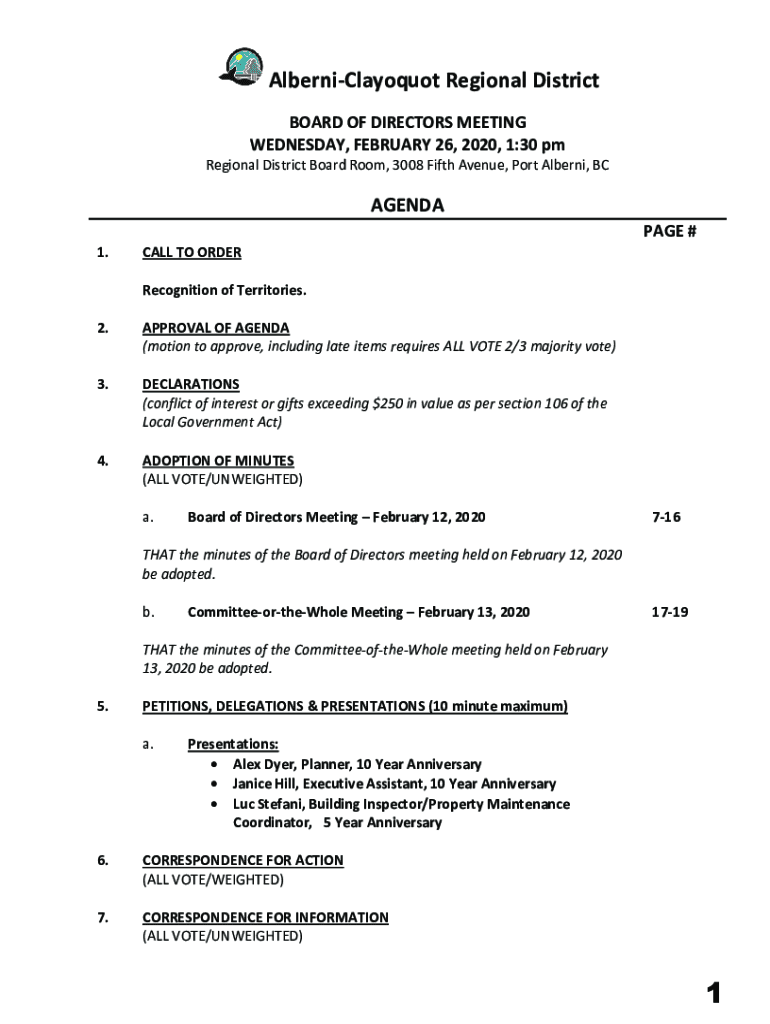 AlberniClayoquot Regional District BOARD OF DIRECTORS MEETING WEDNESDAY, FEBRUARY 26, 2020, 1:30 pmRegional District Board Room, 3008 Fifth Avenue, Port Alberni, BCAGENDA 1.CALL TO ORDERPAGE #Recognition