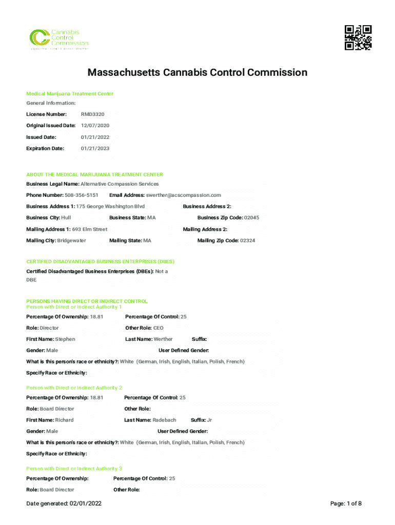Massachusetts Cannabis Control Commission Medical Marijuana Treatment Center General Information: License Number:RMD3320Original Issued Date: 12/07/2020 Issued Date:01/21/2022Expiration Date:01/21/2023ABOUT