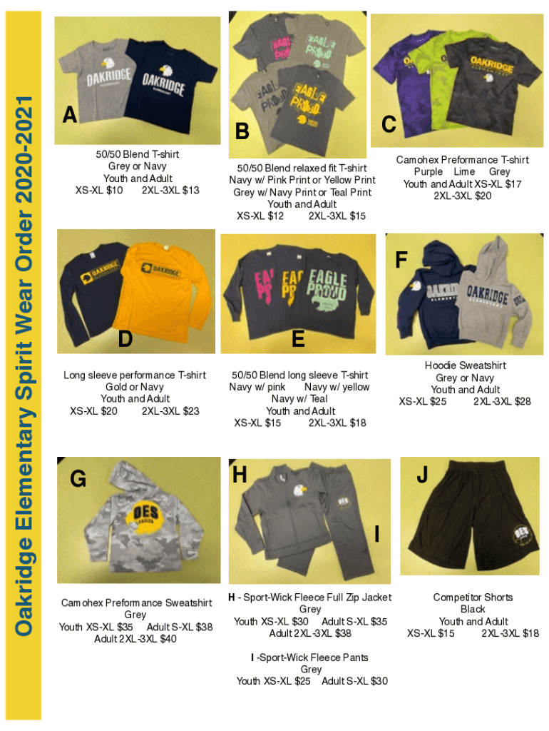 Oakridge Elementary Spirit Wear Order 20202021ACB50/50 Blend Tshirt Grey or Navy Youth and Adult XSXL $10 2XL3XL $1350/50 Blend relaxed fit Tshirt Navy w/ Pink Print or Yellow Print Grey w/ Navy Print